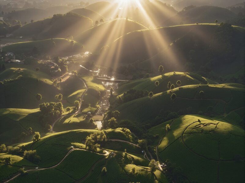 - Địa hình đồi bát úp đặc trưng: Hàng trăm quả đồi chè tròn đều, nối tiếp nhau như những “chiếc bát úp” khổng lồ tạo nên khung cảnh trùng điệp, xanh mướt. Nhìn từ trên cao, đồi chè Long Cốc tựa như một tấm thảm xanh khổng lồ trải dài giữa núi rừng trung du.