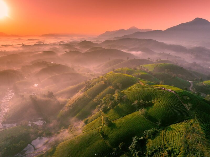 Hình ảnh của đồi chè Long Cốc vào buổi sáng sớm