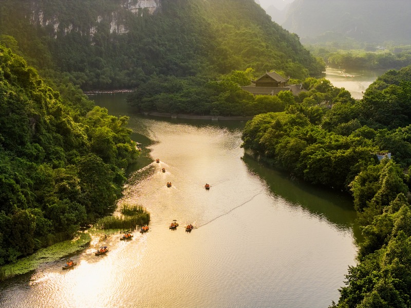 Một trong những trải nghiệm đặc trưng và hấp dẫn nhất khi đến Tràng An chính là ngồi thuyền nan xuôi dòng Sào Khê, len lỏi qua hàng chục hang động tự nhiên như Hang Nấu Rượu, Hang Tối, Hang Sáng hay Hang Ba Giọt. Mỗi tuyến tham quan như vậy sẽ kéo dài khoảng 2 – 3 tiếng, đưa du khách đi qua cảnh quan núi đá vôi trùng điệp, những thung nước phẳng lặng và các ngôi đền cổ kính ẩn hiện giữa non xanh. Đây sẽ là hành trình giúp bạn cảm nhận rõ nét nhất vẻ đẹp “sơn thủy hữu tình” của vùng đất Tràng An.