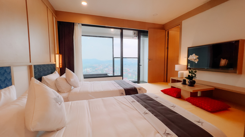 - Khu khách sạn khoáng nóng: Khu lưu trú cao cấp với các phòng nghỉ hiện đại, nhiều hạng phòng tích hợp bể tắm khoáng nóng riêng ngay trong phòng. Du khách đến đây có thể tận hưởng onsen theo phong cách Nhật Bản trọn vẹn riêng tư và sang trọng.